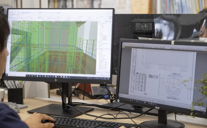 設計施⼯⼀貫⽅式で責任の範囲を明確にしています。またBIM(Building Information Modeling)を⽤いた図⾯作成で構造や設備などの情報をデータ化しています。これにより将来のラインの変更や改修⼯事が容易になり、効率的かつ迅速な対応が可能です。